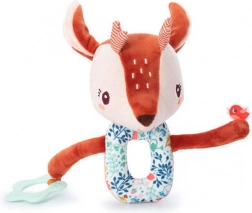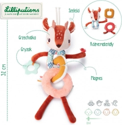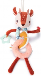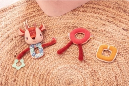La chaîne d’activités Biche Stella est composée de maillons souples reliés par un anneau magnétique central. Un grelot est dissimulé dans la tête de la biche, une oreille bruisse agréablement et une petite figurine d’oiseau – un patch sensoriel – se trouve sur une patte. L’autre patte porte un anneau de dentition étoilé avec reliefs pour soulager les poussées dentaires.