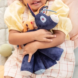 Découvrez un compagnon en peluche qui amuse et apaise. L’ânon IGNACE est tout doux, visuellement stimulant, et, lorsqu’on presse différentes parties de son corps, il joue cinq sons, dont un braiement authentique. Il favorise l’ouïe, la motricité fine et la curiosité.