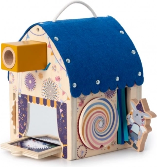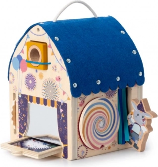La maisonnette est soigneusement fabriquée en contreplaqué de hêtre certifié FSC et agrémentée d’éléments textiles qui enrichissent l’expérience tactile. La surface se nettoie facilement, prête pour un usage quotidien. Idéale comme jouet éducatif pour développer la vision, la coordination œil-main et la concentration.