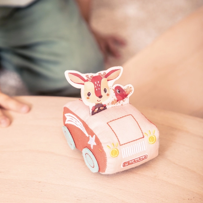 La petite voiture toute douce est décorée de la biche Stella et de l’oiseau Robin, qui ajoutent une touche ludique et attrayante au jouet.