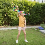 Les enfants peuvent créer leurs propres chorégraphies à la maison ou dans le jardin avec le ruban de danse et sa baguette. L’arc‑en‑ciel de couleurs, combiné à la musique, inspire la joie de danser et de bouger. Le produit convient aux enfants dès 3 ans, filles comme garçons, souhaitant améliorer la coordination œil‑main et les habiletés motrices.