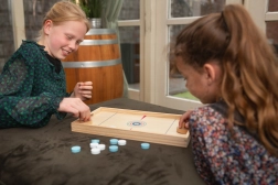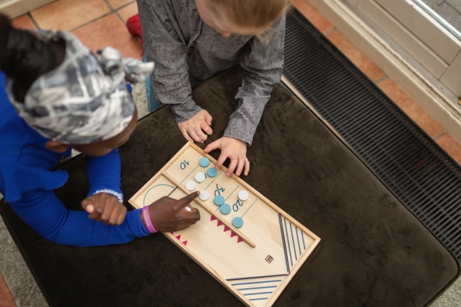 Le hockey de table et jeu mathématique pour enfants offre une double dose de plaisir ! Dans la première partie, deux joueurs doivent propulser leurs jetons sur une zone cible. Dans la seconde, ils s’affrontent au hockey de table jusqu’à ce que l’un des joueurs atteigne sept buts. Les deux jeux sont conçus pour stimuler la coordination œil-main et développer les compétences numériques.