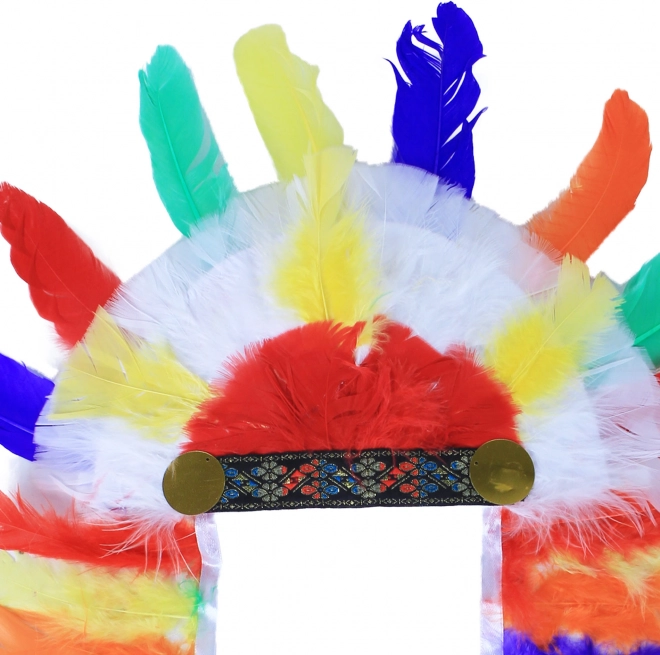 Des plumes vives en rouge, bleu, vert et jaune créent un look de carnaval remarquable et renforcent l’atmosphère du costume amérindien.
