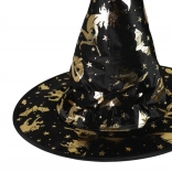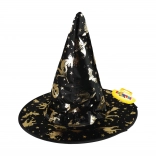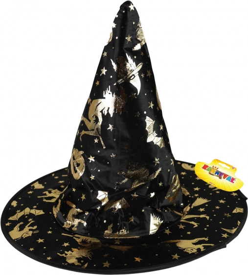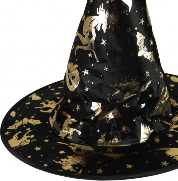 Élégant chapeau de sorcier pour enfant, idéal pour le carnaval, les fêtes scolaires et Halloween. Le chapeau en tissu noir est orné de motifs magiques dorés tels que des étoiles, des chauves-souris et des sorcières. Grâce à sa forme conique classique et à son large bord, il complète facilement tout costume et transforme le petit magicien en star d’Halloween.