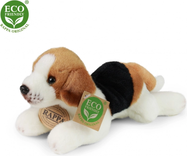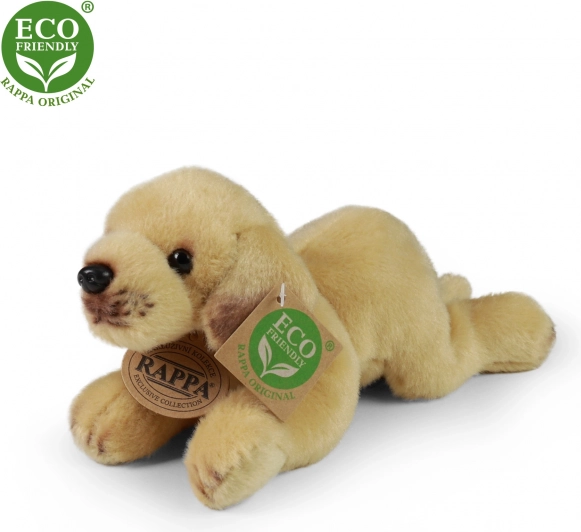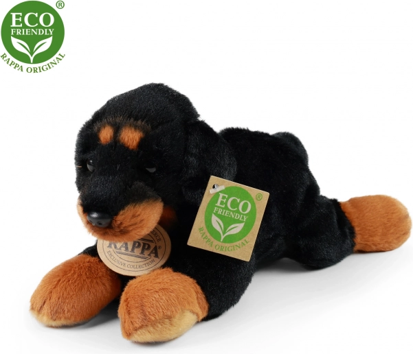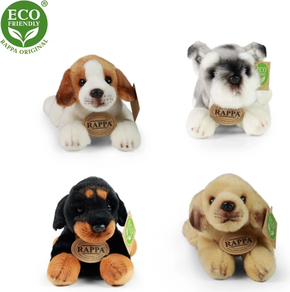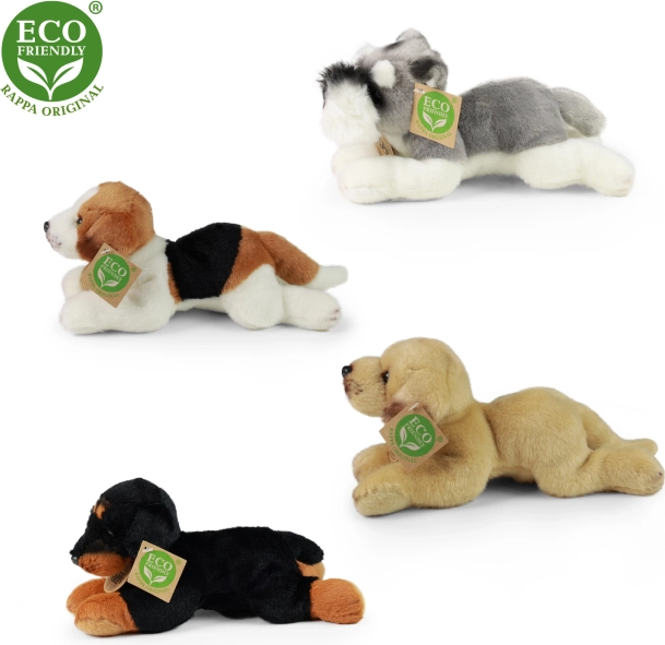 Chien en peluche couché de taille 16 cm, disponible dans différentes races comme le beagle, le griffon, le labrador ou le rottweiler. Fabriqué à partir de matériaux écologiques qui respectent toutes les normes de sécurité.