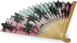 L’éventail séduit par son motif tropical de palmiers sur un fond coloré, apportant fraîcheur et une touche d’exotisme au quotidien.