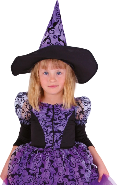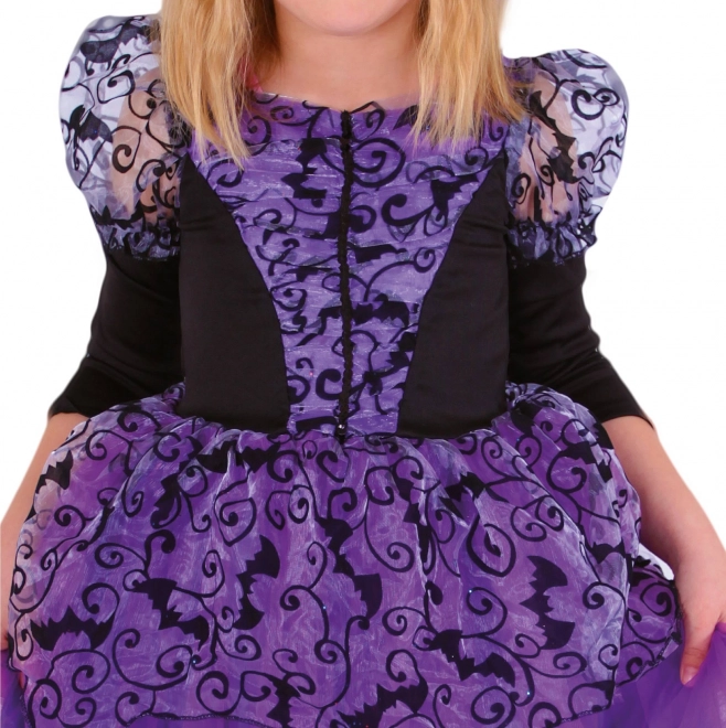 Le déguisement de sorcière pour enfant en taille S, destiné aux enfants de 3 à 6 ans (105–116 cm), apporte amusement et magie à chaque occasion. La robe violette se distingue par sa jupe bouffante et ses manches trois-quarts, ornées d’un motif de chauves-souris noires pour un look authentique.