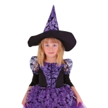 Le déguisement comprend un chapeau assorti, décoré du même motif que la robe, apportant une touche authentique de sorcière.