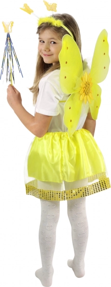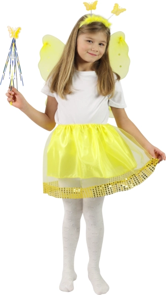 - Contenu de l’emballage : ailes avec tournesol et strass, jupe vaporeuse avec paillettes dorées, serre-tête avec papillons, baguette magique