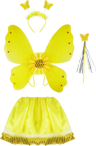 - Ailes avec tournesol et strass ; jupe vaporeuse à paillettes dorées ; serre-tête avec papillons métallisés ; baguette magique