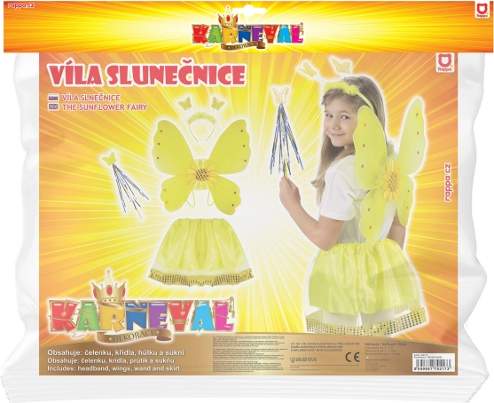 Adorable déguisement enfant tournesol qui transforme en un instant une petite coquette en fée aux ailes de papillon. Le set comprend des ailes ornées d’un tournesol et de strass, une jupe vaporeuse à paillettes, un serre-tête avec papillons et une baguette magique – idéal pour le carnaval et le déguisement pour les 3–10 ans.