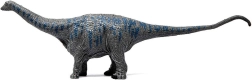 La figurine du brontosaure est finement détaillée, avec une texture de peau réaliste, peinte en gris avec des accents bleus.