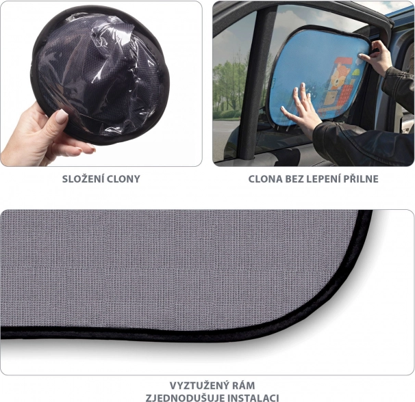 Les pare-soleil disposent d’un cadre renforcé solide mais flexible, qui facilite le montage et le transfert entre véhicules. Grâce à la structure pliable, vous pouvez les ranger facilement dans la poche de portière ou la boîte à gants. L’entretien est simple – un chiffon sec ou légèrement humide suffit.