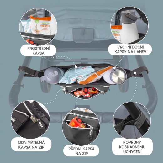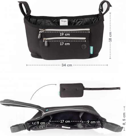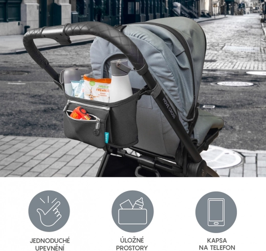 Organiseur universel en néoprène pour poussette, qui protège vos affaires et offre une fixation facile sur la plupart des poussettes grâce aux bandes auto-agrippantes. Voir plus