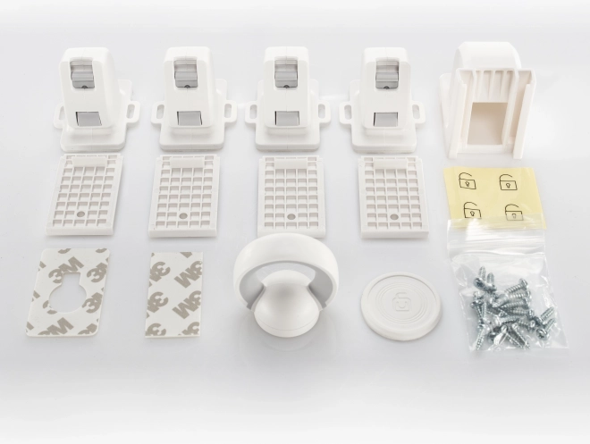 • L’emballage contient 4 fermetures, un gabarit pour un montage facilité, une clé magnétique, un ruban adhésif 3M de qualité, un jeu de vis et des autocollants d’information pour positionner précisément la clé magnétique. Un support mural pour poser la clé, afin de l’avoir toujours à portée de main, est également inclus