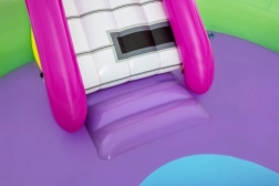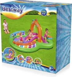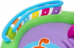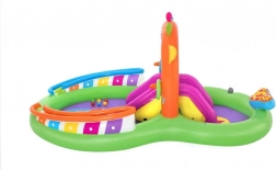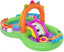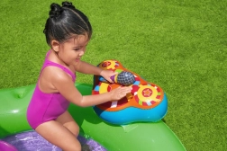 Explorez et profitez de nombreuses fonctions ludiques avec le centre de jeux aquatique gonflable Sing and Splash. Le centre de jeux comprend un microphone et un tambour avec lesquels les enfants peuvent s’amuser et stimuler leur imagination. Deux bassins reliés sont équipés d’un toboggan amovible fixé par cordes et boucles. Un coussin gonflable intégré dans le sol assure un atterrissage en douceur au bas du toboggan. L’arceau avec asperseur intégré se raccorde simplement à un tuyau d’arrosage. On peut lancer des anneaux gonflables sur les pointes de l’arceau. Le set comprend 6 balles colorées que vous pouvez faire descendre sur l’une ou l’autre rampe. Ces jeux sont non seulement amusants, mais développent aussi la coordination œil-main.