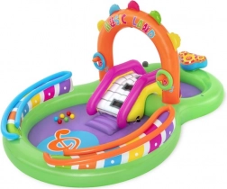 Contenu: 1 petit bassin, 1 toboggan, 1 tambour, 2 anneaux gonflables, 1 microphone, 6 balles colorées, 1 rustine de réparation.