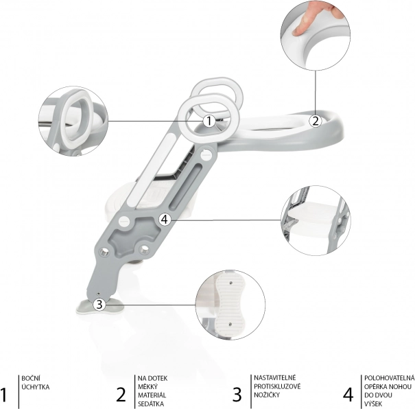 Grâce au réglage en hauteur, le marchepied évolue avec votre enfant jusqu’au moment où il n’en aura plus besoin. Sa structure robuste garantit à l’enfant un sentiment de sécurité en grimpant comme en s’asseyant. Les pieds sont dotés d’une couche antidérapante spéciale qui procure stabilité et soutien. Le marchepied comprend également un siège doux et confortable servant de réducteur pour toilette classique. La forme anatomique du siège, associée à l’arrière relevé, empêche parfaitement toute salissure involontaire.