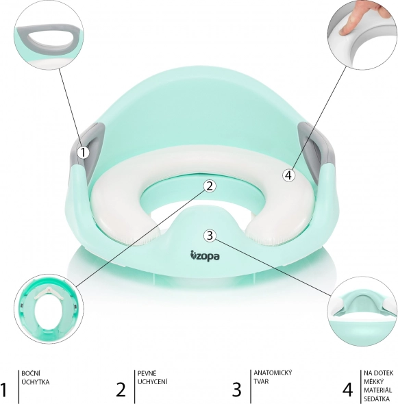 Le passage du pot aux toilettes classiques est un grand changement pour chaque enfant. Avec l’aide pratique de l’abattant WC ZOPA Coach, il y parviendra facilement. L’abattant est fabriqué en plastique résistant, non toxique et sans BPA, testé pour son innocuité. Pour un confort maximal, une insertion souple et imperméable, résistante aux fissures et aux déformations, est fixée à la structure solide de l’abattant. Des poignées intelligemment placées offrent un bon appui en position assise.