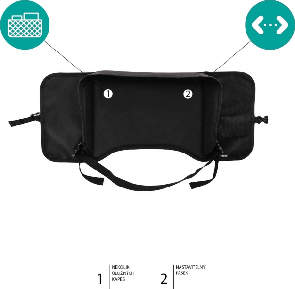 Grâce à la sangle de fixation réglable, le plateau se fixe facilement à la plupart des sièges auto pour enfants à haut dossier. Le textile résistant est facilement lavable, ce qui en fait aussi un excellent support pour le goûter. La finition noire est universelle et apporte une touche propre et élégante.