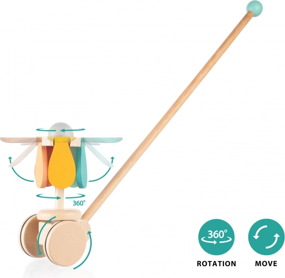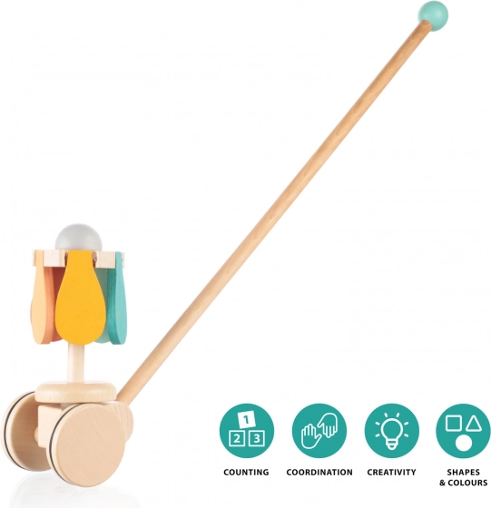 Le pousseur fleur en bois est un compagnon idéal pour les enfants qui apprennent à marcher. Grâce à sa longue tige, il est facile à manier, tandis que la fleur tournante capte l’attention et soutient un mouvement naturel. Une fabrication en bois de qualité, sans arêtes vives, garantit un jeu en toute sécurité à la maison comme à l’extérieur.