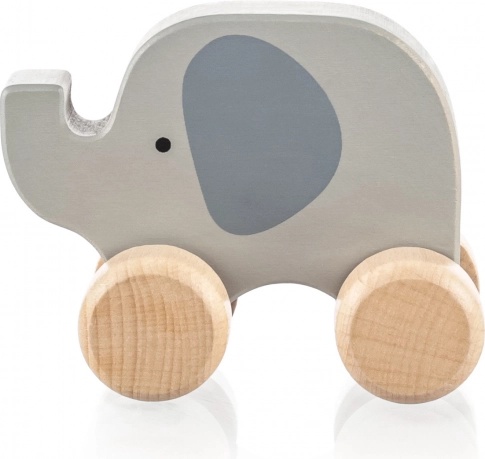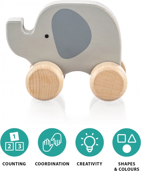 Éléphant en bois sur roulettes en bois naturel. Peintures à base d’eau sûres, roues résistantes et soutien de la motricité et de la coordination. Idéal pour les tout-petits.