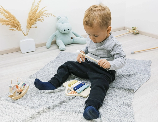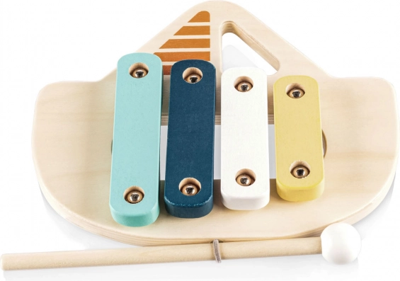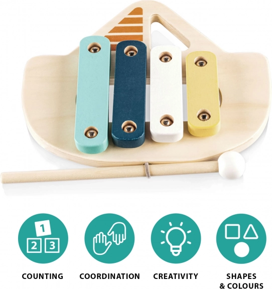 Le xylophone est fabriqué en bois naturel et peint avec des couleurs à base d'eau, garantissant la sécurité des enfants ainsi que le respect de l'environnement. Grâce à ce jouet, les enfants apprendront à reconnaître les premiers sons et mélodies, ce qui est un excellent outil pour développer leur sens du rythme.