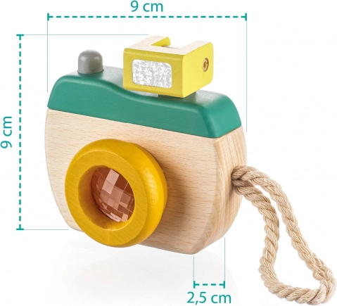 Fabriqué en bois de qualité, cet appareil photo est léger et compact, idéal pour les petits photographes. Il est équipé d’une dragonne solide pour un transport facile.