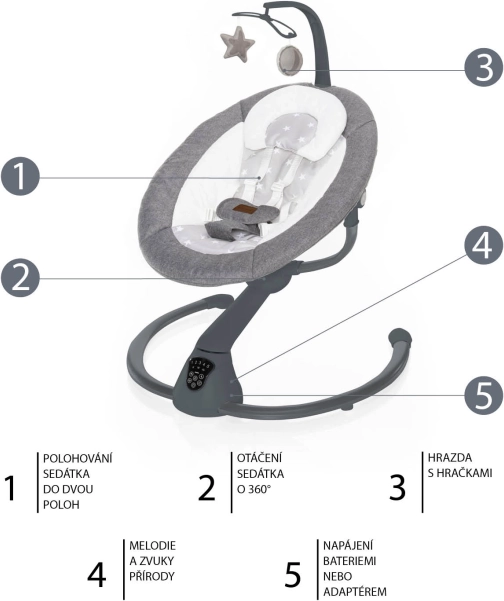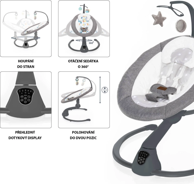 La commande est intuitive via un panneau tactile clair ou avec la télécommande fournie. Le siège doux et généreusement rembourré, doté de deux positions, ainsi que le harnais 5 points offrent un grand confort même lors de siestes prolongées. L’ensemble comprend une arche avec deux jouets en peluche amovibles et des mélodies et sons de la nature avec réglage du volume.