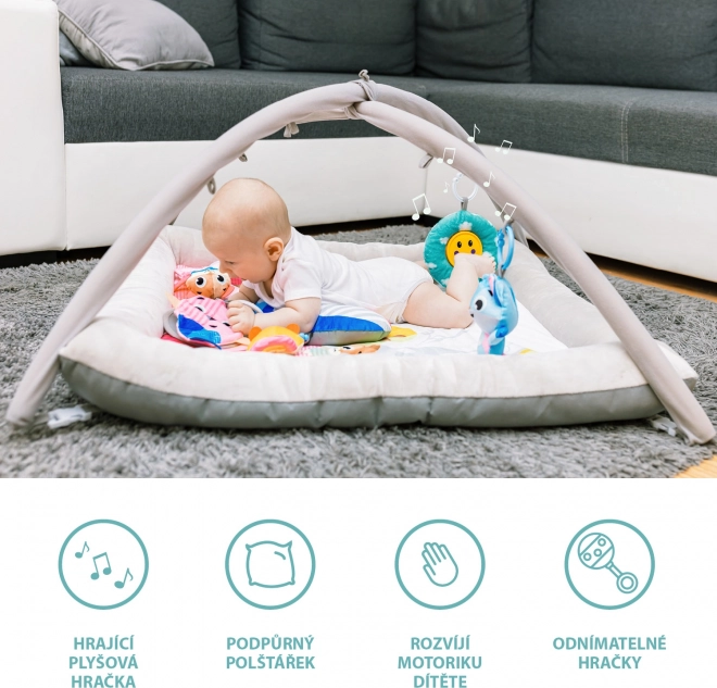 - Tapis d’éveil, arche amovible avec jouets, coussin de soutien