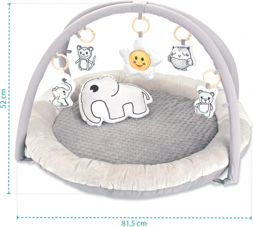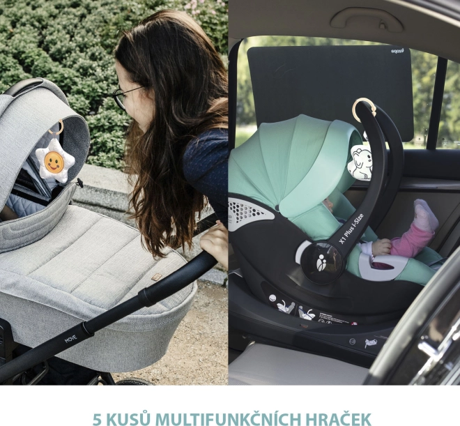 Il comprend une arche avec des peluches interactives dotées de hochets, qui encouragent bébé à bouger, renforcent la motricité fine et soutiennent un développement naturel. Les jouets se détachent facilement pour une utilisation en déplacement – sur le siège auto ou la poussette.