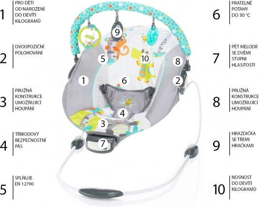 Le transat vibrant Happy se décline dans des couleurs gaies plus vives et contribue à la stimulation des sens des tout-petits dès la naissance jusqu’à 9 kg. Vous l’apprécierez lorsque bébé ne dort pas et que vous souhaitez le calmer, le divertir et en même temps l’impliquer dans la vie de famille. Les enfants adorent le confort du transat, surtout lorsqu’ils peuvent le balancer eux-mêmes par leurs mouvements. La combinaison du bercement, des vibrations, des mélodies et des jouets garantit que votre petit ange ne s’ennuiera pas.