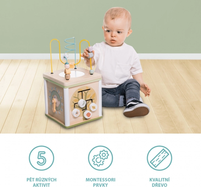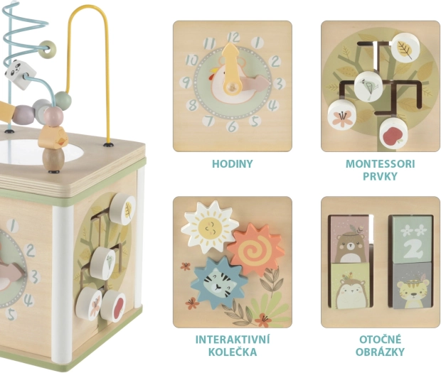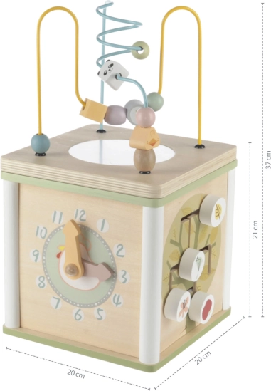 Adorable cube renfermant un puzzle d’activités. Sur les côtés du cube se trouvent des formes en bois rotatives avec différents motifs. Le jouet développe la coordination, la représentation spatiale et la dextérité manuelle. Le déplacement des billes et des formes peut également aider les enfants à apprendre leurs premiers calculs et la reconnaissance des couleurs. Les activités sont fabriquées en bois de haute qualité et avec des peintures à base d’eau.