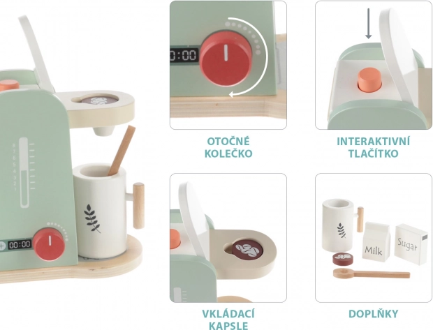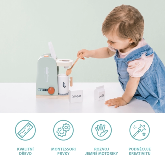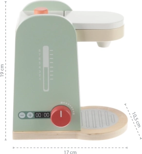 Une cafetière en bois soigneusement conçue invite directement à préparer un bon café. La cafetière dispose de plusieurs boutons qui peuvent être tournés ou pressés. Sont inclus une grande tasse en bois avec une cuillère et des ingrédients pour préparer le café. Le jouet est fabriqué en bois de qualité et avec des peintures à base d’eau.