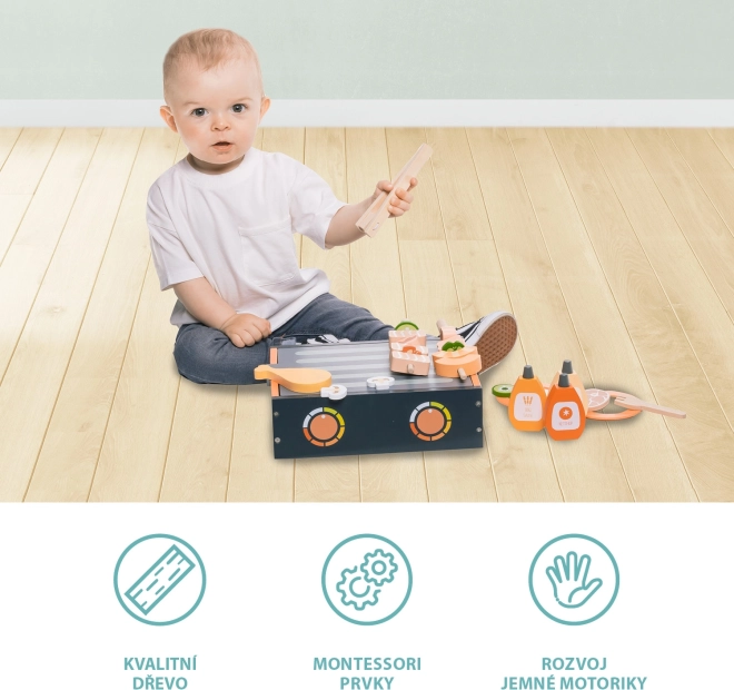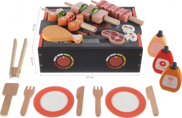 Le barbecue en bois sert également de boîte de rangement pour tous les ingrédients que l’enfant souhaite griller. Il suffit de faire glisser la plaque de cuisson supérieure pour découvrir en dessous de la viande en bois, des légumes, des sauces, des accompagnements, ainsi qu’une assiette, des couverts et des ustensiles de barbecue. Le jouet est fabriqué en hêtre résistant et toutes les peintures utilisées sont sans danger pour la santé et à base d’eau.