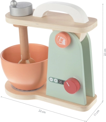 Un mixeur élaboré pour tous les enfants qui veulent préparer les meilleures pâtisseries. Le mixeur dispose de plusieurs boutons qui peuvent être tournés ou pressés. Il comprend un bol dans lequel le robot de cuisine mélange la pâte. Le jouet est fabriqué en bois de qualité et peint avec des peintures à base d’eau.