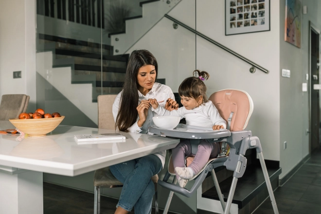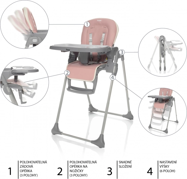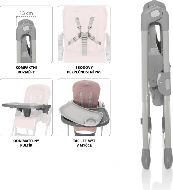 La chaise haute se règle facilement pour offrir une assise aussi confortable que possible. Le dossier réglable peut être positionné sur 3 inclinaisons. Bien entendu, la hauteur est réglable sur 6 positions. Le repose‑pieds est également ajustable. Le plateau amovible comporte un insert qui peut être retiré séparément. La housse de la chaise est lavable et, en cas de salissure, il suffit de l’essuyer avec un chiffon humide. Pour une sécurité maximale de l’enfant, la chaise est équipée d’un harnais de sécurité à 5 points.