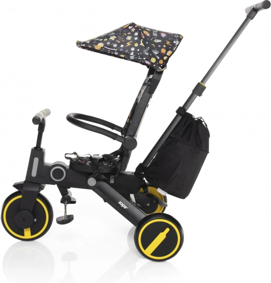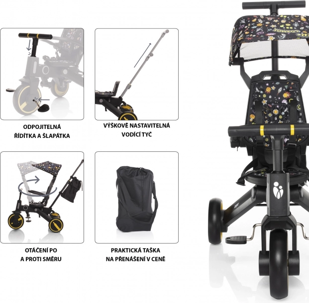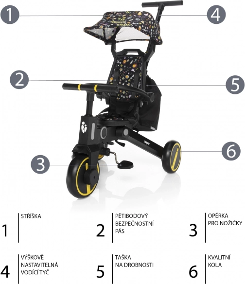 Le tricycle est une alternative plus confortable à la poussette et constitue une étape intermédiaire entre la draisienne et le vélo. Grâce à la tige de guidage réglable en hauteur et à la fonction de débrayage du guidon, il remplace entièrement la poussette et l’enfant s’amuse davantage pendant la promenade. Les repose-pieds amovibles peuvent servir de pédales lorsque l’enfant conduit le tricycle lui-même, ou de repose-jambes pour les plus petits. Le confort de conduite est assuré par l’assise et le dossier, tous deux dotés d’un rembourrage amovible pour un nettoyage simplifié.