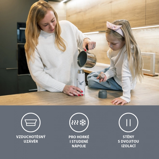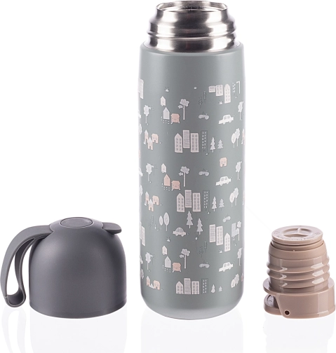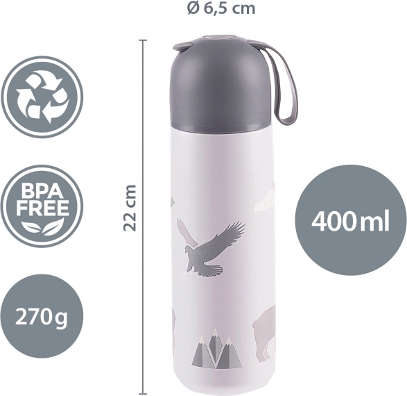 Thermos de qualité pour liquides d’une capacité de 400 ml, qui conserve les boissons chaudes jusqu’à 12 heures et les boissons froides jusqu’à 24 heures. Il est fabriqué en acier inoxydable de haute qualité, résistant à la corrosion. Son couvercle étanche empêche toute fuite et le bouchon verseur supérieur permet de verser confortablement sans se renverser, même en voiture sur une route cahoteuse. Grâce à la double fermeture, vous pouvez également être certain que l’enfant ne se brûlera pas avec le liquide du thermos. Le couvercle du thermos peut être utilisé comme tasse.