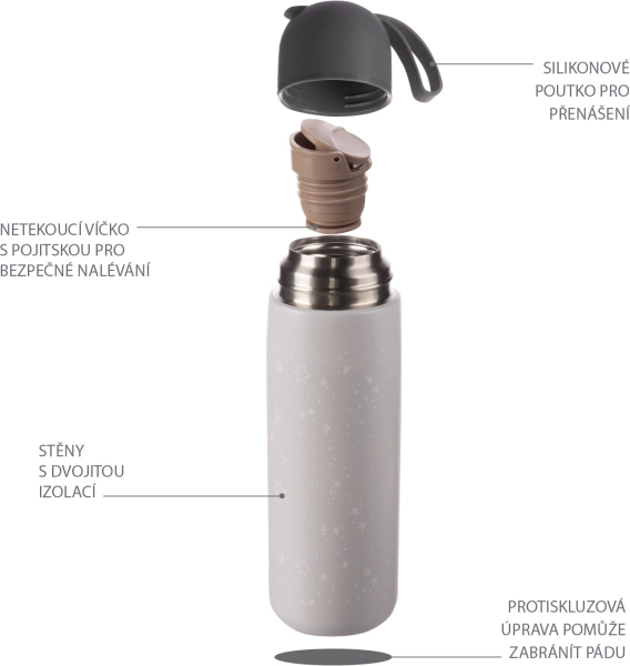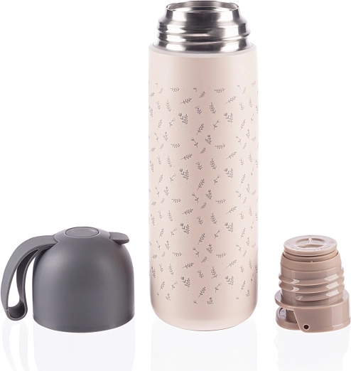 Thermos de qualité pour liquides d’une capacité de 400 ml, qui conserve les boissons chaudes jusqu’à 12 heures et les boissons froides jusqu’à 24 heures. Il est fabriqué en acier inoxydable de qualité, résistant à la corrosion. Un couvercle étanche garantit que le thermos ne fuit pas, et le bouchon supérieur pour un versement facile vous évite de vous renverser, même en voiture sur une route cahoteuse ; vous pouvez également être certain que l’enfant ne se brûlera pas avec le liquide du thermos grâce à la double fermeture. Le couvercle du thermos peut servir de tasse.