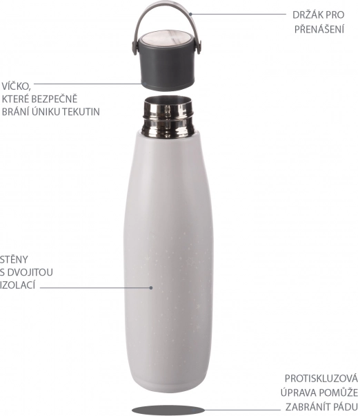 Thermos de qualité pour liquides d’une capacité de 480 ml qui garde les boissons chaudes jusqu’à 12 heures et froides jusqu’à 24 heures. Fabriqué en acier inoxydable de haute qualité, résistant à la corrosion. Le couvercle étanche garantit l’absence de fuites. Grâce à l’isolation sous vide, l’extérieur du thermos ne chauffe pas lorsqu’il est rempli de liquide chaud. Pour une prise en main confortable, le thermos est équipé d’une poignée.