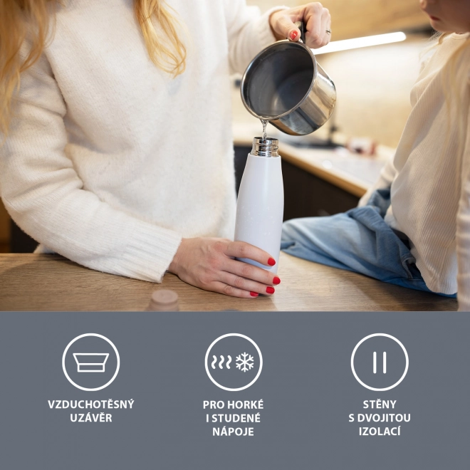 Thermos de qualité pour liquides d’une capacité de 480 ml qui conserve les boissons chaudes jusqu’à 12 heures et les boissons froides jusqu’à 24 heures. Il est fabriqué en acier inoxydable de haute qualité, résistant à la corrosion. Le couvercle étanche garantit l’absence de fuites. Grâce à l’isolation sous vide, le thermos ne chauffe pas à l’extérieur lorsqu’il est rempli de liquide chaud. Pour une prise en main confortable, le thermos est doté d’une poignée.