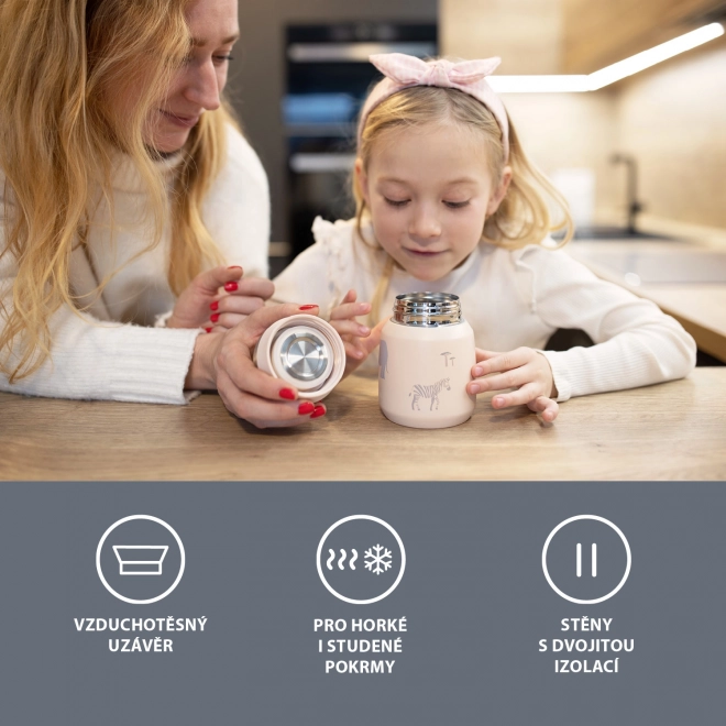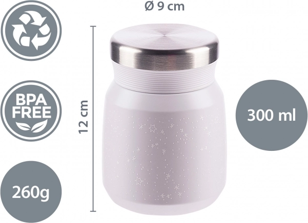 La thermos alimentaire de qualité pour repas et purées d’une capacité de 300 ml conserve les plats chauds jusqu’à 12 heures et les plats froids jusqu’à 24 heures. Elle est fabriquée en acier inoxydable de haute qualité, résistant à la corrosion. Le couvercle hermétique garantit l’étanchéité. Grâce à l’isolation sous vide, l’extérieur de la thermos ne chauffe pas lorsqu’elle contient un aliment chaud.