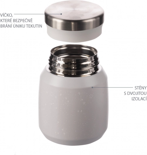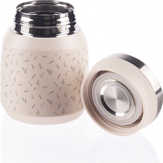 Thermos alimentaire de qualité pour repas et purées d’une capacité de 300 ml, qui maintient les mets chauds jusqu’à 12 heures et froids jusqu’à 24 heures. Il est fabriqué en acier inoxydable de haute qualité, résistant à la corrosion. Le couvercle hermétique garantit l’étanchéité du thermos. Grâce à l’isolation sous vide, le thermos ne chauffe pas à l’extérieur lorsqu’il est rempli de contenu chaud.