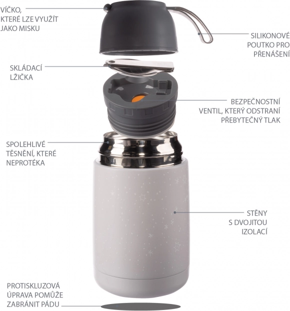 Il comprend une cuillère pliante astucieuse qui s’insère parfaitement dans le bouchon, afin que vous puissiez déguster une bouillie chaude ou une soupe où que vous soyez. Le couvercle du thermos peut servir de tasse ou de bol. Le bouchon supérieur est doté d’une valve de sécurité qui libère l’excès d’air créant de la pression. En relâchant l’air comprimé, le récipient s’ouvre facilement et l’on évite tout risque de brûlure par la vapeur.