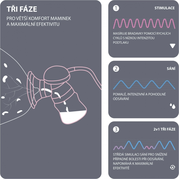 • 3 phases – stimulation, aspiration, combinaison stimulation et aspiration pour une extraction parfaite du lait maternel