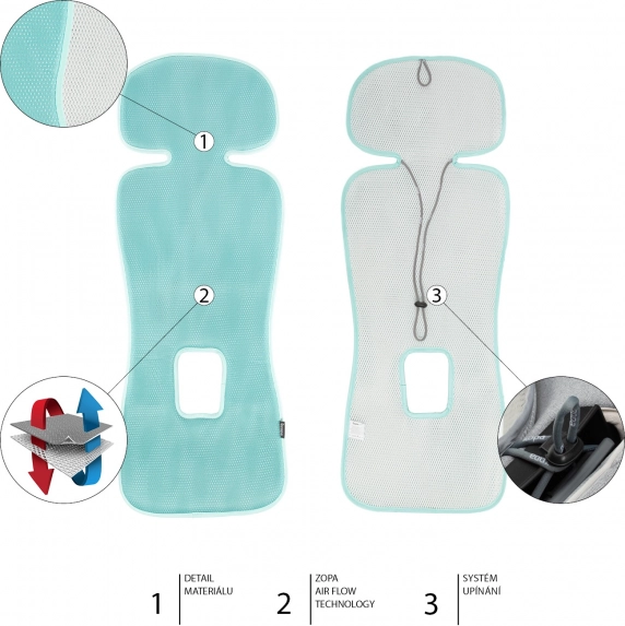 La respirabilité est assurée par la technologie unique Zopa Air Flow, un tissu à structure hexagonale 3D permettant la circulation de l’air à travers l’insert, entre le siège auto et l’enfant.