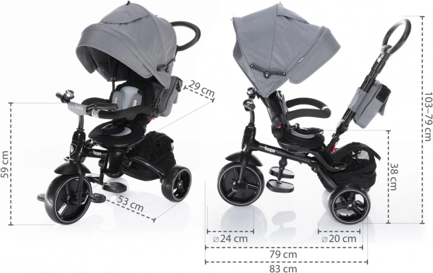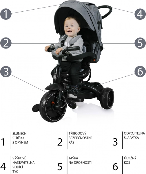 Un autre avantage est le démontage facile de la capote, de la barre de protection et des repose-pieds, permettant à l'enfant de profiter pleinement de la conduite. Le tricycle est équipé d'un panier arrière spacieux et d'un sac, vous avez donc toujours assez d'espace pour tous les essentiels. Son design moderne garantit que le tricycle attire toujours l'attention.