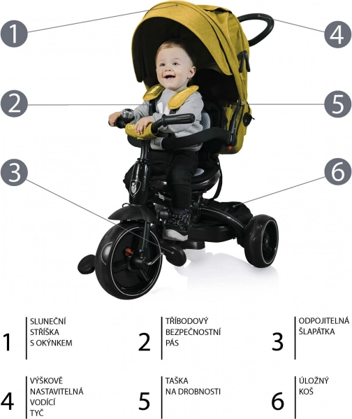 Le Citi Trike dans la couleur attrayante Curry Yellow est destiné aux enfants âgés de 10 mois à 3 ans et offre une capacité de charge maximale de 30 kg. Il comprend une barre de guidage avec hauteur réglable pour une manœuvre facile :