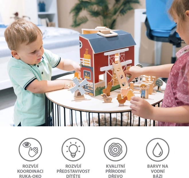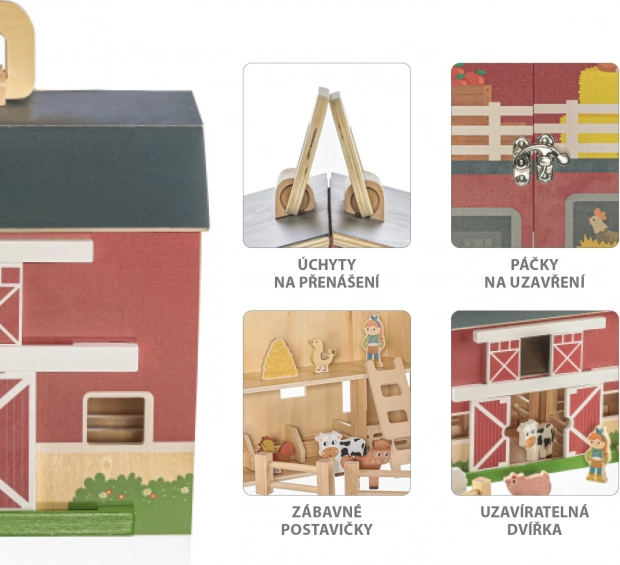 Le jouet est conçu pour résister à un usage intensif et convient aux enfants à partir de trois ans. Il comprend une grange en bois avec des figurines d’animaux réalistes. Grâce à ce jouet, les enfants développent imagination, coordination et interaction sociale.